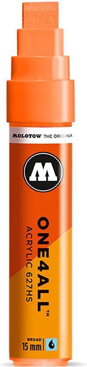 Molotow ONE4ALL™ 15mm 627HS Marker Kleurnaam: DARE Orange Deze Molotow ONE4ALL™ 15mm 627HS Markers zijn ideaal voor elke ondergrond. Nib Maat: 15mm Vilt Nib, vervangbaar System: Pomp actie, Flowmaster klep voor een actieve verf-flow controle en de gepatenteerde capillaire technologie. Inhoud: One4all verf. De zeer hoog gepigmenteerde acryl gebaseerde hybride verf is gemakkelijk mengbaar met andere One4All kleuren (individuele tinten), het kan worden verdund met water (doorschijnende effecten) of met aceton (voor permanente hechting op vettige oppervlakken). Hij werkt op bijna elke ondergrond, is zijdemat, droogt snel, heeft een ongelooflijke dekking en is absoluut 100% UV-bestendig. Kan worden gebruikt voor beeldende kunst, hobby, industrie en ambacht voor binnen-en buiten toepassing. Perfect op harde materialen (leer, metaal, glas, steen, plastic, boetseerklei, enz.) zoals mobiele telefoons, computers, schoenen, modelbouw etc. Ook geweldig op absorberende oppervlakken (papier,