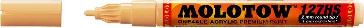 Molotow ONE4ALL™ 127HS 2mm Verfstift Kleurnaam: Sahara Beige Pastel Deze Molotow ONE4ALL™ 127HS 2mm Marker zijn ideaal voor elke ondergrond. Systeem: Pomp actie, Flowmaster klep voor een actieve verf-flow controle en de gepatenteerde capillaire technologie. Inhoud: One4all verf. De zeer hoog gepigmenteerde acryl gebaseerde hybride verf is gemakkelijk mengbaar met andere One4All kleuren (individuele tinten), het kan worden verdund met water (doorschijnende effecten) of met aceton (voor permanente hechting op vettige oppervlakken). Hij werkt op bijna elke ondergrond, is zijdemat, droogt snel, heeft een ongelooflijke dekking en is absoluut 100% UV-bestendig. Kan worden gebruikt voor beeldende kunst, hobby, industrie en ambacht voor binnen-en buiten toepassing. Perfect op harde materialen (leer, metaal, glas, steen, plastic, boetseerklei, enz.) zoals mobiele telefoons, computers, schoenen, modelbouw etc. Ook geweldig op absorberende oppervlakken (papier, karton, terracotta, hout,