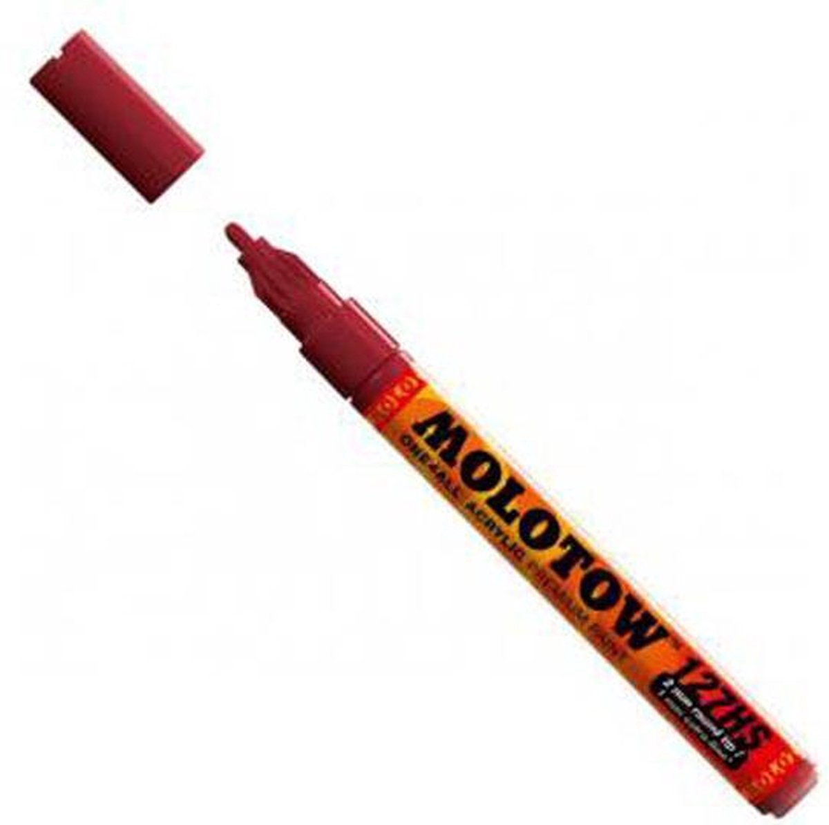 Molotow ONE4ALL™ 127HS 2mm Verfstift Kleurnaam: Burgundy Deze Molotow ONE4ALL™ 127HS 2mm Marker zijn ideaal voor elke ondergrond. Systeem: Pomp actie, Flowmaster klep voor een actieve verf-flow controle en de gepatenteerde capillaire technologie. Inhoud: One4all verf. De zeer hoog gepigmenteerde acryl gebaseerde hybride verf is gemakkelijk mengbaar met andere One4All kleuren (individuele tinten), het kan worden verdund met water (doorschijnende effecten) of met aceton (voor permanente hechting op vettige oppervlakken). Hij werkt op bijna elke ondergrond, is zijdemat, droogt snel, heeft een ongelooflijke dekking en is absoluut 100% UV-bestendig. Kan worden gebruikt voor beeldende kunst, hobby, industrie en ambacht voor binnen-en buiten toepassing. Perfect op harde materialen (leer, metaal, glas, steen, plastic, boetseerklei, enz.) zoals mobiele telefoons, computers, schoenen, modelbouw etc. Ook geweldig op absorberende oppervlakken (papier, karton, terracotta, hout, enz.) zoals