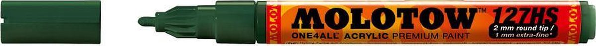 Molotow ONE4ALL™ 127HS 2mm Verfstift Kleurnaam: Future Green Deze Molotow ONE4ALL™ 127HS 2mm Marker zijn ideaal voor elke ondergrond. Systeem: Pomp actie, Flowmaster klep voor een actieve verf-flow controle en de gepatenteerde capillaire technologie. Inhoud: One4all verf. De zeer hoog gepigmenteerde acryl gebaseerde hybride verf is gemakkelijk mengbaar met andere One4All kleuren (individuele tinten), het kan worden verdund met water (doorschijnende effecten) of met aceton (voor permanente hechting op vettige oppervlakken). Hij werkt op bijna elke ondergrond, is zijdemat, droogt snel, heeft een ongelooflijke dekking en is absoluut 100% UV-bestendig. Kan worden gebruikt voor beeldende kunst, hobby, industrie en ambacht voor binnen-en buiten toepassing. Perfect op harde materialen (leer, metaal, glas, steen, plastic, boetseerklei, enz.) zoals mobiele telefoons, computers, schoenen, modelbouw etc. Ook geweldig op absorberende oppervlakken (papier, karton, terracotta, hout, enz.) zoals