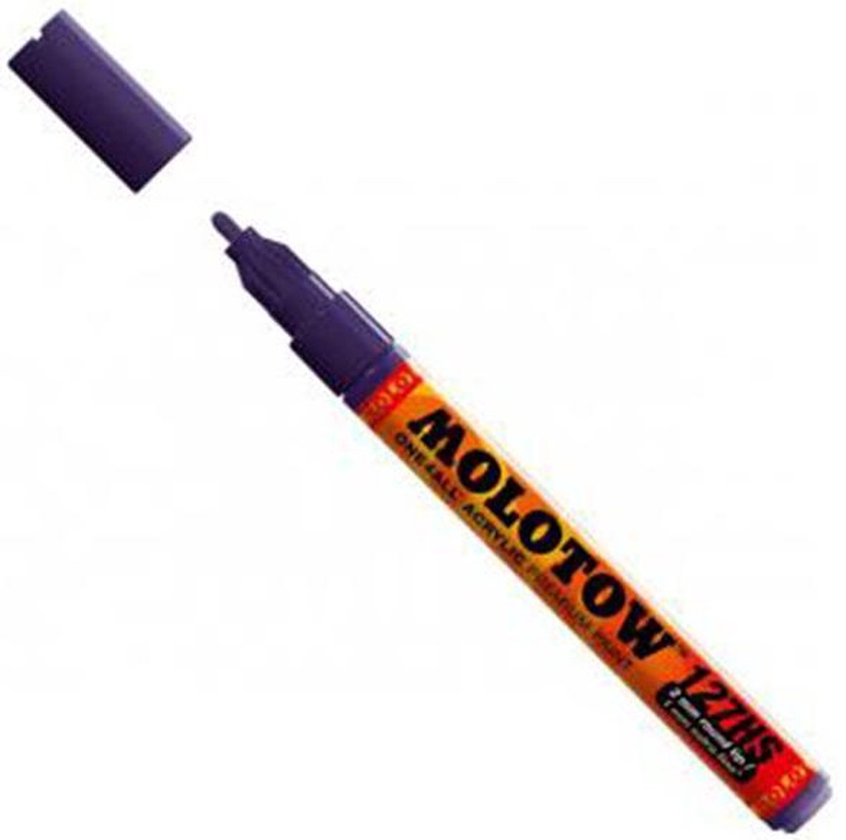 Molotow ONE4ALL™ 127HS 2mm Verfstift Kleurnaam: Violet Dark Deze Molotow ONE4ALL™ 127HS 2mm Marker zijn ideaal voor elke ondergrond. Systeem: Pomp actie, Flowmaster klep voor een actieve verf-flow controle en de gepatenteerde capillaire technologie. Inhoud: One4all verf. De zeer hoog gepigmenteerde acryl gebaseerde hybride verf is gemakkelijk mengbaar met andere One4All kleuren (individuele tinten), het kan worden verdund met water (doorschijnende effecten) of met aceton (voor permanente hechting op vettige oppervlakken). Hij werkt op bijna elke ondergrond, is zijdemat, droogt snel, heeft een ongelooflijke dekking en is absoluut 100% UV-bestendig. Kan worden gebruikt voor beeldende kunst, hobby, industrie en ambacht voor binnen-en buiten toepassing. Perfect op harde materialen (leer, metaal, glas, steen, plastic, boetseerklei, enz.) zoals mobiele telefoons, computers, schoenen, modelbouw etc. Ook geweldig op absorberende oppervlakken (papier, karton, terracotta, hout, enz.) zoals