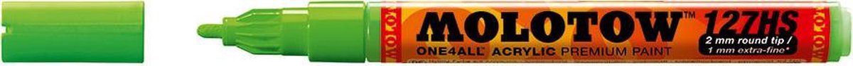 Molotow ONE4ALL™ 127HS 2mm Verfstift Kleurnaam: Neon Green Fluorescent Deze Molotow ONE4ALL™ 127HS 2mm Marker zijn ideaal voor elke ondergrond. Systeem: Pomp actie, Flowmaster klep voor een actieve verf-flow controle en de gepatenteerde capillaire technologie. Inhoud: One4all verf. De zeer hoog gepigmenteerde acryl gebaseerde hybride verf is gemakkelijk mengbaar met andere One4All kleuren (individuele tinten), het kan worden verdund met water (doorschijnende effecten) of met aceton (voor permanente hechting op vettige oppervlakken). Hij werkt op bijna elke ondergrond, is zijdemat, droogt snel, heeft een ongelooflijke dekking en is absoluut 100% UV-bestendig. Kan worden gebruikt voor beeldende kunst, hobby, industrie en ambacht voor binnen-en buiten toepassing. Perfect op harde materialen (leer, metaal, glas, steen, plastic, boetseerklei, enz.) zoals mobiele telefoons, computers, schoenen, modelbouw etc. Ook geweldig op absorberende oppervlakken (papier, karton, terracotta, hout,