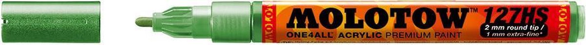 Molotow ONE4ALL™ 127HS 2mm Verfstift Kleurnaam: Metallic Green Deze Molotow ONE4ALL™ 127HS 2mm Marker zijn ideaal voor elke ondergrond. Systeem: Pomp actie, Flowmaster klep voor een actieve verf-flow controle en de gepatenteerde capillaire technologie. Inhoud: One4all verf. De zeer hoog gepigmenteerde acryl gebaseerde hybride verf is gemakkelijk mengbaar met andere One4All kleuren (individuele tinten), het kan worden verdund met water (doorschijnende effecten) of met aceton (voor permanente hechting op vettige oppervlakken). Hij werkt op bijna elke ondergrond, is zijdemat, droogt snel, heeft een ongelooflijke dekking en is absoluut 100% UV-bestendig. Kan worden gebruikt voor beeldende kunst, hobby, industrie en ambacht voor binnen-en buiten toepassing. Perfect op harde materialen (leer, metaal, glas, steen, plastic, boetseerklei, enz.) zoals mobiele telefoons, computers, schoenen, modelbouw etc. Ook geweldig op absorberende oppervlakken (papier, karton, terracotta, hout, enz.)