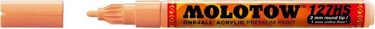Molotow ONE4ALL™ 127HS 2mm Verfstift Kleurnaam: Peach Pastel Deze Molotow ONE4ALL™ 127HS 2mm Marker zijn ideaal voor elke ondergrond. Systeem: Pomp actie, Flowmaster klep voor een actieve verf-flow controle en de gepatenteerde capillaire technologie. Inhoud: One4all verf. De zeer hoog gepigmenteerde acryl gebaseerde hybride verf is gemakkelijk mengbaar met andere One4All kleuren (individuele tinten), het kan worden verdund met water (doorschijnende effecten) of met aceton (voor permanente hechting op vettige oppervlakken). Hij werkt op bijna elke ondergrond, is zijdemat, droogt snel, heeft een ongelooflijke dekking en is absoluut 100% UV-bestendig. Kan worden gebruikt voor beeldende kunst, hobby, industrie en ambacht voor binnen-en buiten toepassing. Perfect op harde materialen (leer, metaal, glas, steen, plastic, boetseerklei, enz.) zoals mobiele telefoons, computers, schoenen, modelbouw etc. Ook geweldig op absorberende oppervlakken (papier, karton, terracotta, hout, enz.) zoals