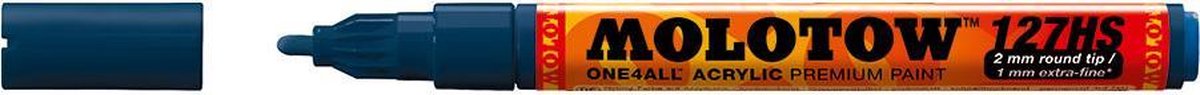 Molotow ONE4ALL™ 127HS 2mm Verfstift Kleurnaam: Petrol Deze Molotow ONE4ALL™ 127HS 2mm Marker zijn ideaal voor elke ondergrond. Systeem: Pomp actie, Flowmaster klep voor een actieve verf-flow controle en de gepatenteerde capillaire technologie. Inhoud: One4all verf. De zeer hoog gepigmenteerde acryl gebaseerde hybride verf is gemakkelijk mengbaar met andere One4All kleuren (individuele tinten), het kan worden verdund met water (doorschijnende effecten) of met aceton (voor permanente hechting op vettige oppervlakken). Hij werkt op bijna elke ondergrond, is zijdemat, droogt snel, heeft een ongelooflijke dekking en is absoluut 100% UV-bestendig. Kan worden gebruikt voor beeldende kunst, hobby, industrie en ambacht voor binnen-en buiten toepassing. Perfect op harde materialen (leer, metaal, glas, steen, plastic, boetseerklei, enz.) zoals mobiele telefoons, computers, schoenen, modelbouw etc. Ook geweldig op absorberende oppervlakken (papier, karton, terracotta, hout, enz.) zoals