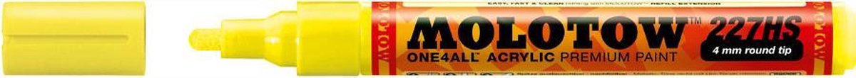 Molotow ONE4ALL™ 227HS 4mm Verfstift Kleurnaam: Neon Yellow Fluorescent Deze Molotow ONE4ALL™ 227HS 4mm Markers zijn ideaal voor elke ondergrond. 227HS marker op acryl basis met een verwisselbare 4mm ronde tip. One4all – De referentie klasse op het gebied van markers. Ongeëvenaarde dekking, heldere kleuren (100% UV-bestendigheid), Flowmaster ventiel voor een actieve kleur controle en met een gepatenteerde capillaire techniek. Deze baanbrekende hybride inkt kan zowel met water of aceton worden verdund. Een voorbeeld van de te bewerken oppervlakken zijn: metaal, canvas, steen, glas, plastic, leer, papier, karton, hout, textiel, keramiek, etc.
