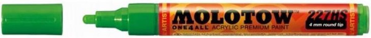 Molotow ONE4ALL™ 227HS 4mm Verfstift Kleurnaam: KACAO77 Green Deze Molotow ONE4ALL™ 227HS 4mm Markers zijn ideaal voor elke ondergrond. 227HS marker op acryl basis met een verwisselbare 4mm ronde tip. One4all – De referentie klasse op het gebied van markers. Ongeëvenaarde dekking, heldere kleuren (100% UV-bestendigheid), Flowmaster ventiel voor een actieve kleur controle en met een gepatenteerde capillaire techniek. Deze baanbrekende hybride inkt kan zowel met water of aceton worden verdund. Een voorbeeld van de te bewerken oppervlakken zijn: metaal, canvas, steen, glas, plastic, leer, papier, karton, hout, textiel, keramiek, etc.