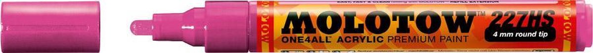 Molotow ONE4ALL™ 227HS 4mm Verfstift Kleurnaam: Magenta Deze Molotow ONE4ALL™ 227HS 4mm Markers zijn ideaal voor elke ondergrond. 227HS marker op acryl basis met een verwisselbare 4mm ronde tip. One4all – De referentie klasse op het gebied van markers. Ongeëvenaarde dekking, heldere kleuren (100% UV-bestendigheid), Flowmaster ventiel voor een actieve kleur controle en met een gepatenteerde capillaire techniek. Deze baanbrekende hybride inkt kan zowel met water of aceton worden verdund. Een voorbeeld van de te bewerken oppervlakken zijn: metaal, canvas, steen, glas, plastic, leer, papier, karton, hout, textiel, keramiek, etc.