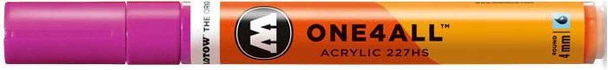 Molotow ONE4ALL™ 227HS 4mm Verfstift Kleurnaam: Fuchsia Pink Deze Molotow ONE4ALL™ 227HS 4mm Markers zijn ideaal voor elke ondergrond. 227HS marker op acryl basis met een verwisselbare 4mm ronde tip. One4all – De referentie klasse op het gebied van markers. Ongeëvenaarde dekking, heldere kleuren (100% UV-bestendigheid), Flowmaster ventiel voor een actieve kleur controle en met een gepatenteerde capillaire techniek. Deze baanbrekende hybride inkt kan zowel met water of aceton worden verdund. Een voorbeeld van de te bewerken oppervlakken zijn: metaal, canvas, steen, glas, plastic, leer, papier, karton, hout, textiel, keramiek, etc.