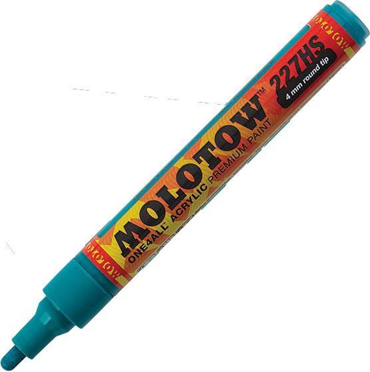 Molotow ONE4ALL™ 227HS 4mm Verfstift Kleurnaam: Turquoise Deze Molotow ONE4ALL™ 227HS 4mm Markers zijn ideaal voor elke ondergrond. 227HS marker op acryl basis met een verwisselbare 4mm ronde tip. One4all – De referentie klasse op het gebied van markers. Ongeëvenaarde dekking, heldere kleuren (100% UV-bestendigheid), Flowmaster ventiel voor een actieve kleur controle en met een gepatenteerde capillaire techniek. Deze baanbrekende hybride inkt kan zowel met water of aceton worden verdund. Een voorbeeld van de te bewerken oppervlakken zijn: metaal, canvas, steen, glas, plastic, leer, papier, karton, hout, textiel, keramiek, etc.
