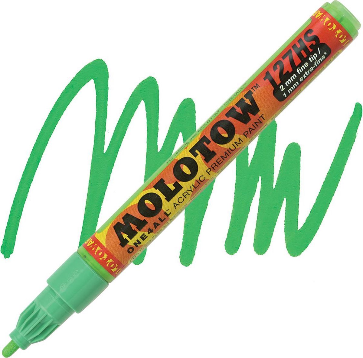 Kleurnaam: KACAO77 Green Deze Molotow ONE4ALL™ 127HS 2mm Marker zijn ideaal voor elke ondergrond. Systeem: Pomp actie, Flowmaster klep voor een actieve verf-flow controle en de gepatenteerde capillaire technologie. Inhoud: One4all verf. De zeer hoog gepigmenteerde acryl gebaseerde hybride verf is gemakkelijk mengbaar met andere One4All kleuren (individuele tinten), het kan worden verdund met water (doorschijnende effecten) of met aceton (voor permanente hechting op vettige oppervlakken). Hij werkt op bijna elke ondergrond, is zijdemat, droogt snel, heeft een ongelooflijke dekking en is absoluut 100% UV-bestendig. Kan worden gebruikt voor beeldende kunst, hobby, industrie en ambacht voor binnen-en buiten toepassing. Perfect op harde materialen (leer, metaal, glas, steen, plastic, boetseerklei, enz.) zoals mobiele telefoons, computers, schoenen, modelbouw etc. Ook geweldig op absorberende oppervlakken (papier, karton, terracotta, hout, enz.) zoals canvas, caps, aardewerk etc. Groot