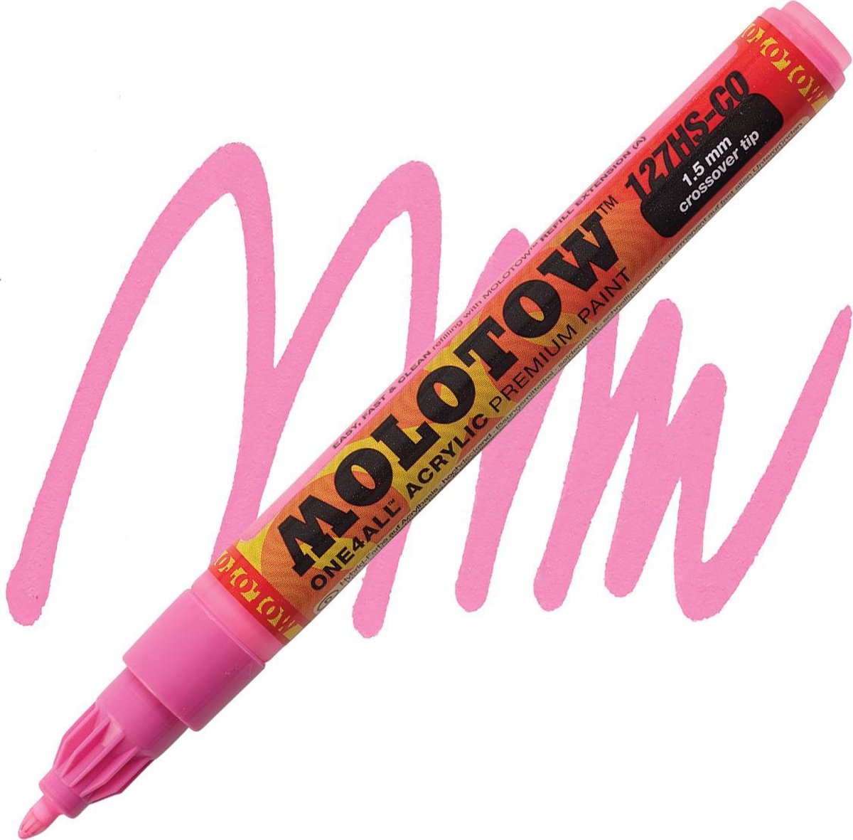 Deze Molotow ONE4ALL™ 127HS0CO 1,5mm Marker zijn ideaal voor elke ondergrond. Systeem: Pomp actie, Flowmaster klep voor een actieve verf-flow controle en de gepatenteerde capillaire technologie. Inhoud: One4all verf. De zeer hoog gepigmenteerde acryl gebaseerde hybride verf is gemakkelijk mengbaar met andere One4All kleuren (individuele tinten), het kan worden verdund met water (doorschijnende effecten) of met aceton (voor permanente hechting op vettige oppervlakken). Hij werkt op bijna elke ondergrond, is zijdemat, droogt snel, heeft een ongelooflijke dekking en is absoluut 100% UV-bestendig. Kan worden gebruikt voor beeldende kunst, hobby, industrie en ambacht voor binnen-en buiten toepassing. Perfect op harde materialen (leer, metaal, glas, steen, plastic, boetseerklei, enz.) zoals mobiele telefoons, computers, schoenen, modelbouw etc. Ook geweldig op absorberende oppervlakken (papier, karton, terracotta, hout, enz.) zoals canvas, caps, aardewerk etc. Groot kleurbereik door de