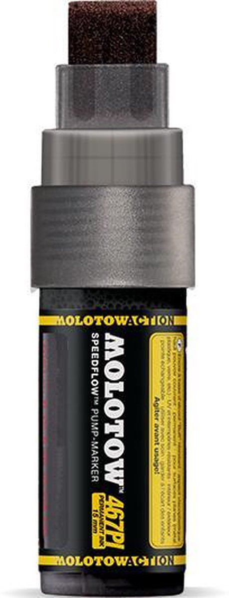De Molotow SPEEDFLOW™ 467PI Marker 15 mm is de kortste marker, waardoor ze ideaal zijn voor je portemonnee. Uitgerust met de gepatenteerde Flowmaster ™ pomp-ventiel en vervangbare 15 mm Brede Tip, deze kleine krachtpatser zorgt voor een constante stroom inkt zorgt. Gevuld met de Speedflow cocktail inkt. Deze mega glimmende, gitzwarte inkt is op basis van alcohol en bevat synthetische bitumen en garanatiert een permanente, visco-plastic verf (signaal zwart). Bovendien is het zeer ondoorzichtig sterk UV-en weerbestendig, sneldrogend, slijtvast en daardoor geschikt voor gebruik op alle binnen-en buitentoepassingen. Navulbaar met alle MOLOTOW ™-inkt en kleuren.