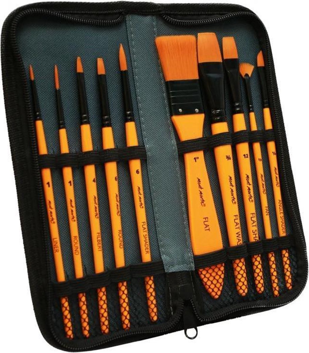 De acrylverf penseelset van Mont Marte is een prachtige selectie taklon borstelharen, ideaal voor acrylprojecten. De handige ritssluiting is perfect voor op reis en helpt om de levensduur van uw penselen te verlengen. KENMERKEN: - 10 penselen (1 x Angle Shader 1/4, 1 x Ventilator 2/0, 1 x Flat Shader 12, 1 x Flat Wash 3/4, 1 x Flat 1 , 1 x Round 6, 1 x Flat Shader -6, 1 x Filbert 4, 1 x voering 1, 1 x ronde 1) - Perfecte starter set - Zeer geschikt om mee te nemen - Korte ergonomische borstels met handvat - Ideaal voor schilderen met acrylverf - Materiaal haren: Taklon Wat is 'taklon' Taklon is een synthetische vezel die zo zacht is als echt haar, hierdoor zijn de penselen ook diervriendelijk . Taklon heeft als eigenschap dat het soepel en glad werkt. De penseel is tevens goed met water uit te spoelen, wat een voordeel is als je veel met één penseel van kleur wisselt. De haren zitten vlot weer in model. TIPS: - Laat de verf niet uitharden op de penseel - Spoel de kwast grondig uit