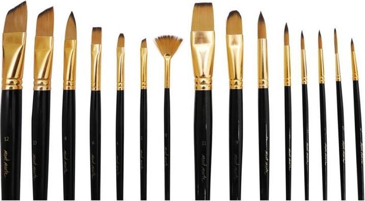 Hoogwaardige taklon penselen set. Deze 15-delige taklon-penselenset is een geweldige introductie tot professionele penselen. De etui met ritssluiting maakt reizen met je penselen gemakkelijk en kan worden opgevouwen tot een opgeruimd overzicht voor snelle toegang terwijl u schildert. Het is perfect om je penselen geordend en in topconditie te houden. Elke borstel in deze geweldige set heeft een tweekleurige taklon-borstel die het meest geschikt is voor gebruik met acryl, aquarellen en gouache. Deze extreem veelzijdige borstels kunnen ook worden gebruikt met oliën om een ??gladde afwerking te creëren. Met de zachte filamenten kunnen kunstenaars een gelijkmatige, vloeiende afwerking produceren en in een groot aantal vormen en maten komen. Verf waar de dag je ook brengt met de 15-delige Mont Marte studio borstelset met etui. Kenmerken: Bevat 15 tweekleurige taklon-penselen in een etui: vlak 2/0, rigger 3/0, waaier 0, vlak 1, hoek 2, ronde 3, hazelaar 4, hoek 5, platte 6, ronde 7,