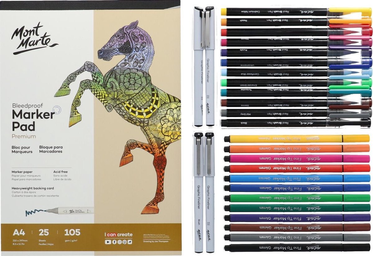 Teken en ontwerp naar hartenlust met onze Premium Illustratie set. Het wordt geleverd met een reeks stiften en pennen die perfect zijn voor illustratie, handlettering, scrapbooking en bullet journaling. Creëer je eigen ontwerpen met deze alles-in-één handletterset / scrapbook set. Het wordt geleverd met een reeks fijne markers en pennen die perfect zijn voor het maken van fijne lijnen, vegende lijnen en speciale effecten. In deze alles in 1 set krijg je niet alleen stiften en pennen, maar er zit ook nog eens een 25 vellen speciaal papier erbij op A4 formaat zodat je meteen kunt gaan oefenen. Leuk als cadeau, voor iemand anders of voor jezelf. Inhoud set: 12 markers met fijne punt 12 echte brushpennen 4 grafische fineliners 1 A4-schrijfblok (25 vellen) Handige tips: Voor het beste resultaat gebruikt u de Dual Line Lettering Pennen op ongestreken karton of papier. Mont Marte Mont Marte is van origine een Australisch merk dat in 15 jaar uitgegroeid is tot de Australische marktleider