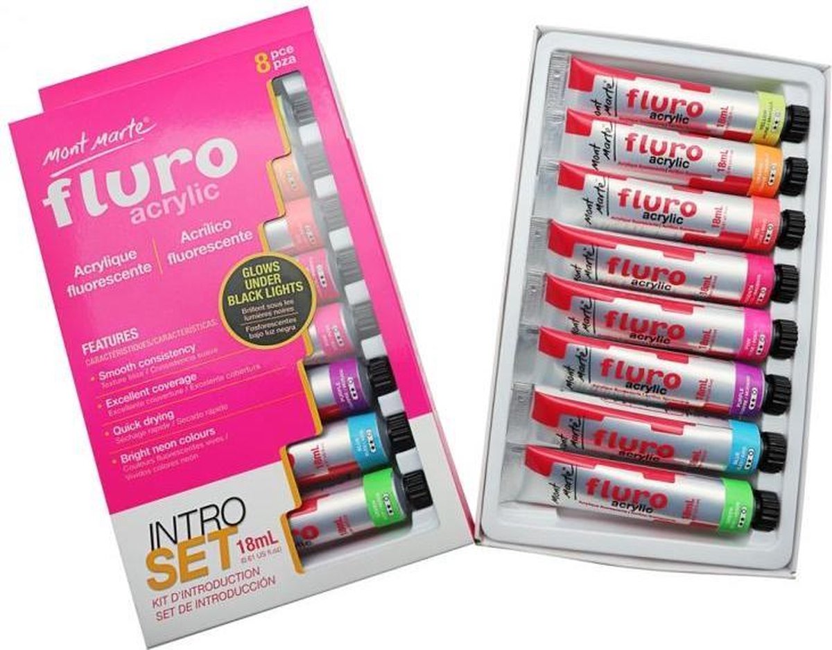 Mont Marte Fluro Acrylic basis set 8 x 18ml. Mont Marte fluorescerende verf is perfect voor het toevoegen van lichtgevende kleuren aan uw kunstprojecten. Deze set heeft 8 felle kleuren in tubes van 18 ml die gloeien onder blacklight en een zachte glans hebben op verschillende oppervlakken, zoals canvas, karton en hout. De soepele consistentie en ondoorzichtige afwerking van elke fluorescerende 18 ml tubes in deze set biedt een schitterende neon-look. Maak heldere kunstwerken en ambachtelijke projecten thuis of op school met de Mont Marte Fluro Acrylverf Intro Set. Kenmerken: 8 heldere neon kleuren in tubes van 18 ml (geel, oranje, rood, magenta, roze, paars, blauw, groen) Gladde glans op verschillende oppervlakken Gloeit op onder black light Soepele consistentie en ondoorzichtige dekking Snel drogend Geschikt voor thuis, in de studio of op school Inspiratievideo: http://montmarte.net/assets/MMTV/VideoFiles/PMFL8181.mp4 Mont Marte Mont Marte is van origine een Australisch merk dat in