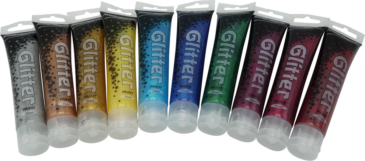 Set van 10 tubes glitterverf van 75ml per stuk. Mont Marte Glitter paints. Mont Marte Glitterverven zijn ideaal voor extra laten opvallen van je kunstwerk of knutselwerk; Laat je fantasie de vrije loop. Het is een transparante verf die door en door gevuld is met glitters waardoor het een heel mooi schitterend effect geeft. Deze set bevat 10 verschillende heldere glitter kleuren waarmee je genoeg variatie hebt. Het hoge glittergehalte maakt deze verven leuk en verbluffend om los of gelaagd over bestaande kunstwerken te gebruiken om hoogtepunten en schittering toe te voegen - laat je kunstwerken schitteren met deze glitterverf. KENMERKEN 10 kleuren in 1 set Transparante basis, gevuld met glitters per kleur 10 Felle kleuren Hoog glittergehalte Snel drogend Inspiratievideo: https://youtu.be/SHNC0FdzsM8 TIPS Gebruik op papier of posterboard, versier kaders, lampen of kaarsen voor extra plezier. Laat je fantasie de vrije loop Kan worden gebruikt op niet-poreuze materialen Niet aanbevolen