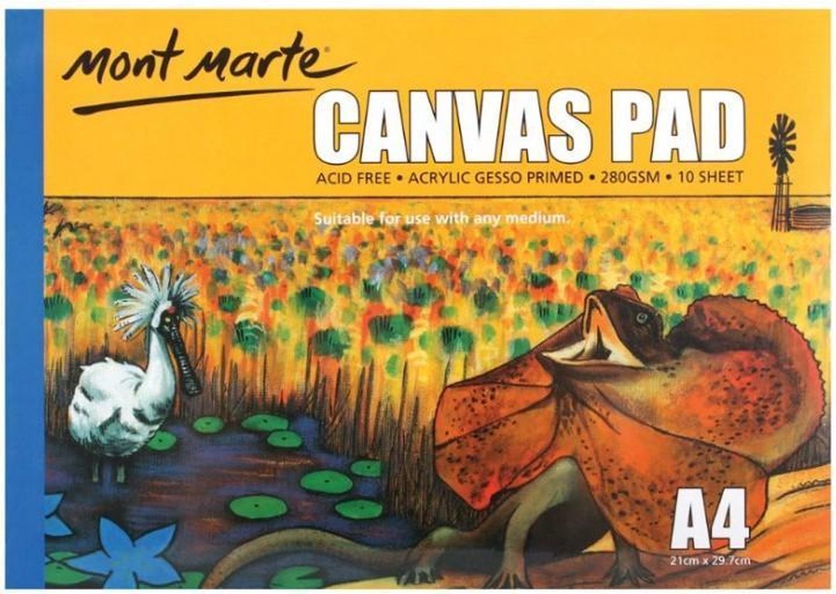 Hoge kwaliteit 280 grams canvas papier Gesso primed. Zuurvrij A4 papier met canvas structuur. Geschikt voor acrylverf, potlood etc. Uitvoering op blok, 10 vel op een blok. Wat is Gesso Primed? Gesso is een primer welke bestaat uit een krijt /gips mengsel, waardoor de oppervlakte voorbereid is om te kunnen beschilderen. Een primer zorgt ervoor dat de verf niet opgezogen of afgestoten wordt door de ondergrond waar je de verf uiteindelijk op aan wilt brengen. Mont Marte Mont Marte is van origine een Australisch merk dat in 15 jaar uitgegroeid is tot de Australische marktleider in kunstproducten en beschikbaar in meer dan 70 landen over de hele wereld. Vanwege de steeds groeiende vraag naar Mont Marte waarde en kwaliteit breidt het assortiment steeds verder uit. Met meer dan 9 miljoen YouTube-weergaven biedt Mont Marte een steeds groter wordende lijst met honderden inspirerende clips, populaire Q & A en gratis kunstlessen voor alle niveaus en productsoorten. We zijn vastberaden dat "kunst