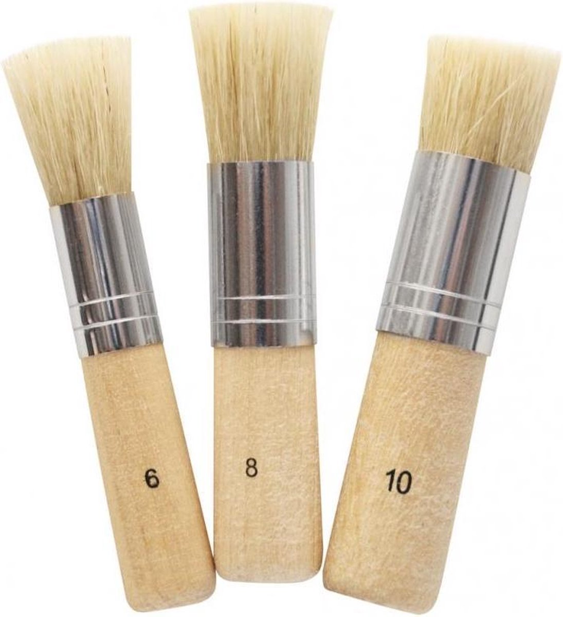 Mont Marte tamponeerkwasten zijn varkenshaar kwasten met een platte kop die ideaal zijn voor het aanbrengen van scherpe stempels, puntjes maken en om interessante structuren en patronen creëren. De korte brede, natuurlijke houten handgreep is gemakkelijk vast te pakken en heeft een naadloze aluminium ring. KENMERKEN - Set van 3 penselen (1 x Flat 6, 1 x Flat 8 en 1 x Flat 10) - Kort, natuurlijk houten handvat - Materiaal: Varkenshaar Geschikt om te gebruiken in combinatie met: - Mont Marte olieverf - Mont Marte Acrylverf - Mont Marte Gouache verf TIPS Laat de verf niet opdrogen in de borstel. Verwijder zoveel mogelijk verf met een papieren handdoek voordat u afspoelt met water (Acryl, Aquarellen, Gouache-verven) of terpentijn gevolgd door schoner of zeepwater (verven op oliebasis) Mont Marte Mont Marte is van origine een Australisch merk dat in 15 jaar uitgegroeid is tot de Australische marktleider in kunstproducten en beschikbaar in meer dan 70 landen over de hele wereld. Vanwege de