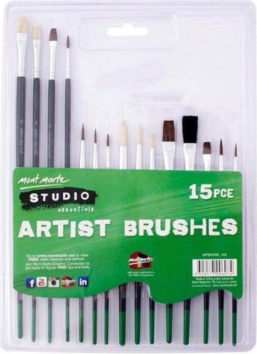 Deze 15-delige set bestaat uit natuurlijke en synthetische haren in een groot aantal maten en vormen. Een fantastische introductieset voor kinderen en de kortere lengte handgreep is gemakkelijk voor hen vast te houden. KENMERKEN - 15 penselen (verschillende penseelvormen en -groottes) - Platte punten werken ideaal voor schaduw en bedekken brede gebieden - Ronde punten zijn ideaal voor lijnwerk, gecontroleerde slagen en details Geschikt voor gebruik met: *Mont Marte olieverf *Mont Marte acrylverf *Mont Marte Poster verf *Mont Marte aquarelverf TIPS Laat de verf niet opdrogen in de borstel, dit verkort de levensduur. Verwijder zoveel mogelijk verf met een papieren handdoek voordat u afspoelt met water (acrylverf, posterverf, aquarellen) of terpentijn, gevolgd door schoner of zeepwater (verven op oliebasis.) Mont Marte Mont Marte is van origine een Australisch merk dat in 15 jaar uitgegroeid is tot de Australische marktleider in kunstproducten en beschikbaar in meer dan 70 landen over de