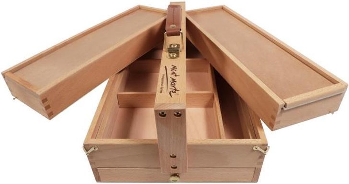 Deze Art Box is geweldig om al je tekengereedschappen bij elkaar te houden. De verschillende lagen kunnen individueel worden vergrendeld met haakjes. De stevige handgreep maakt het mogelijk om hem met 1 hand op te tillen. Kenmerken Mont Marte multifunctionele opbergkist, schilderskist, tekenkist •Afmetingen: 37.4x24.4x15.9cm •Kunstlederen handgreep •Messing hardware •3 opslaglagen voor items van verschillende formaten •Beukenhout LET OP: Accessoires niet inbegrepen Mont Marte Mont Marte is van origine een Australisch merk dat in 15 jaar uitgegroeid is tot de Australische marktleider in kunstproducten en beschikbaar in meer dan 70 landen over de hele wereld. Vanwege de steeds groeiende vraag naar Mont Marte waarde en kwaliteit breidt het assortiment steeds verder uit. Met meer dan 9 miljoen YouTube-weergaven biedt Mont Marte een steeds groter wordende lijst met honderden inspirerende clips en gratis online kunstlessen voor alle niveaus en productsoorten. We zijn vastberaden