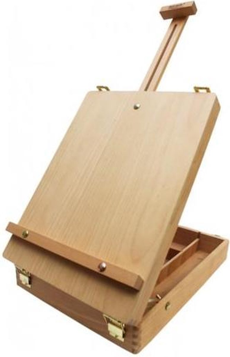 Houten tafel ezel met een maximale canvas hoogte van 52cm. Perfect voor kunstenaars die onderweg schilderen of de schildersezel af en toe willen gebruiken. Ons tafelmodel schildersezel is een effectieve, draagbare stand- en opslagoplossing. Deze kist ezel heeft een glad, beukenhouten oppervlak en wordt geleverd met een ingebouwde en verstelbare canvas-klem en canvassteun. Het praktische en effectieve ontwerp vormt de perfecte tool voor tekenen en schilderen op zowel canvas als papier. Dit tafelmodel schildersezel biedt niet alleen stevige ondersteuning voor uw kunstwerken, maar ook handige opbergvakken voor uw gereedschap en materialen voor u als kunstenaar. Wanneer het niet in gebruik is, vouwt het compact ineen voor eenvoudig transport en opslag. Kenmerken Mont Marte houten tafelezel: •Opbergcompartimenten voor verven en gereedschappen •Schuifdoekregelaar •Kunstlederen handvat voor comfortabele grip •Gladde beukenhouten afwerking •Gevouwen afmetingen: 36 x 27 x 9,5 cm