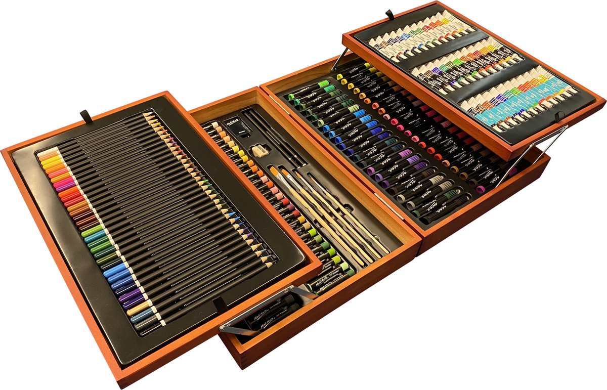 Maak prachtige tekeningen en schilderijen met onze gemixte-kunstenaars set. Met deze luxe kunst set heb je alles wat je nodig hebt om je kunst te creëren en te oefenen. de set is 174 delig. Het beschikt over een reeks verven en gereedschappen, waaronder op water-, acryl- en oliebasis. Deze set is netjes ingepakt in een houten draagtas en maakt het gemakkelijk om georganiseerd te blijven en je spullen naar verschillende bestemmingen te brengen. Kenmerken: •Houten koffer •174-delige set •Inclusief 42 viltstiften, 54 oliepastels, 34 kleurenpotloden en 36 verven (12 x 12 ml acryl, 12 x 12 ml aquarel en 12 x 12 ml olie) •Inclusief 2 ronde penselen, 2 platte penselen, 1 x 2B potlood, 1 x 4B potlood, 1 puntenslijper en 1 wisser Mont Marte Mont Marte is van origine een Australisch merk dat in 15 jaar uitgegroeid is tot de Australische marktleider in kunstproducten en beschikbaar in meer dan 70 landen over de hele wereld. Vanwege de steeds groeiende vraag naar Mont Marte waarde en