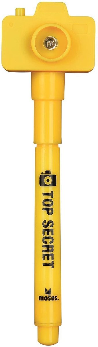 Moses geheimcodestift met camera Magisch! Deze te gekke stift schrijft 'onzichtbaar', met het afneembare UV-cameraatje op uiteinde licht de tekst op. Heel handig voor het bewaren van al jouw geheimen! Garant voor uren speelplezier voor kleine speurders! Specificaties: Kleur: geel Geslacht: junior Materiaal: kunststof Lengte: 11 cm Batterijen: ja, inclusief (3 AG-knoopcelbatterijen) Leeftijd: vanaf 3 jaar Inhoud: 1 Geheimcodestift met camera 3 AG3-Knoopcelbatterijen