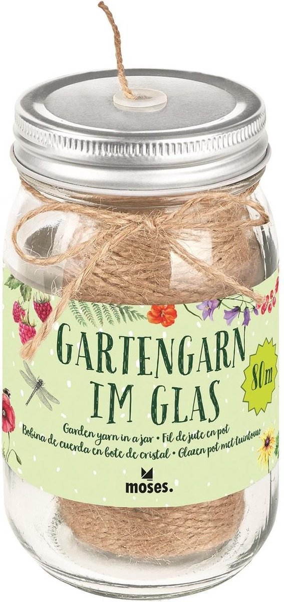 Moses tuintouw in glazen pot 80 meter jute-touw in mooie glazen pot met draaidop. In de dop een handige opening waardoor het touw zich kan afrollen. Ideaal voor in en rondom huis! Specificaties: Kleur: transparant Materiaal pot: glas Materiaal touw: jute Hoogte pot: 13 cm Lengte touw: 80 meter