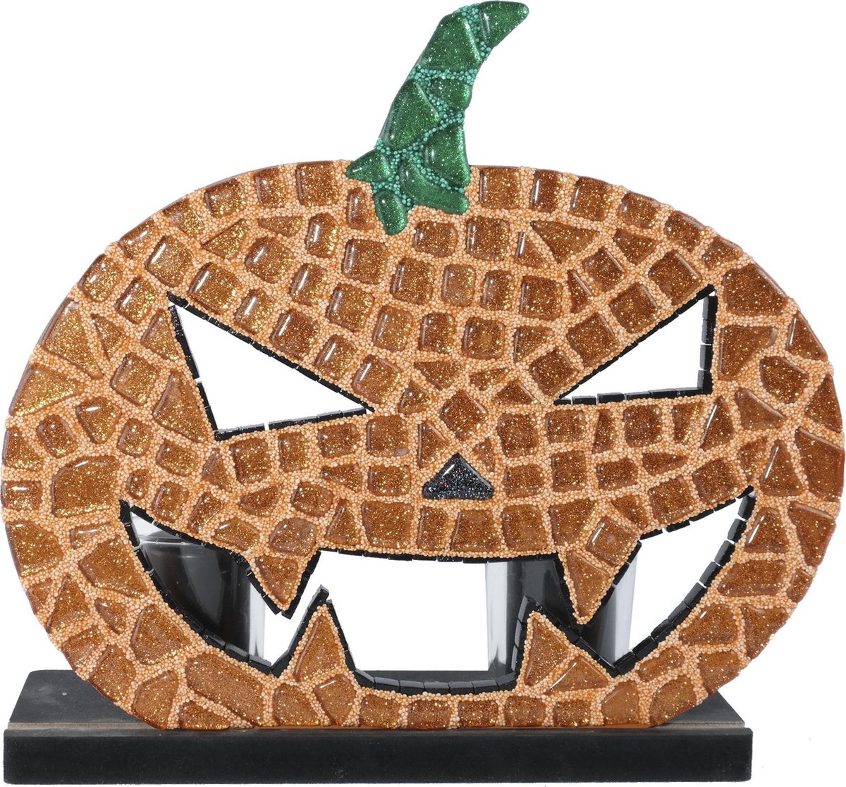 Compleet mozaiekpakket voor het mozaieken van een pompoenhoofd met een standaard waar 2 kaarsen in kunnen
