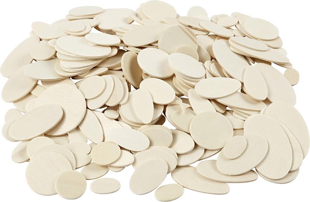 Pak van hout mozaiek in 3 verschillende vormen. 4 verschillende maten van elke vorm; rond, ovaal en eivormig.Pak van hout mozaiek in 3 verschillende vormen.