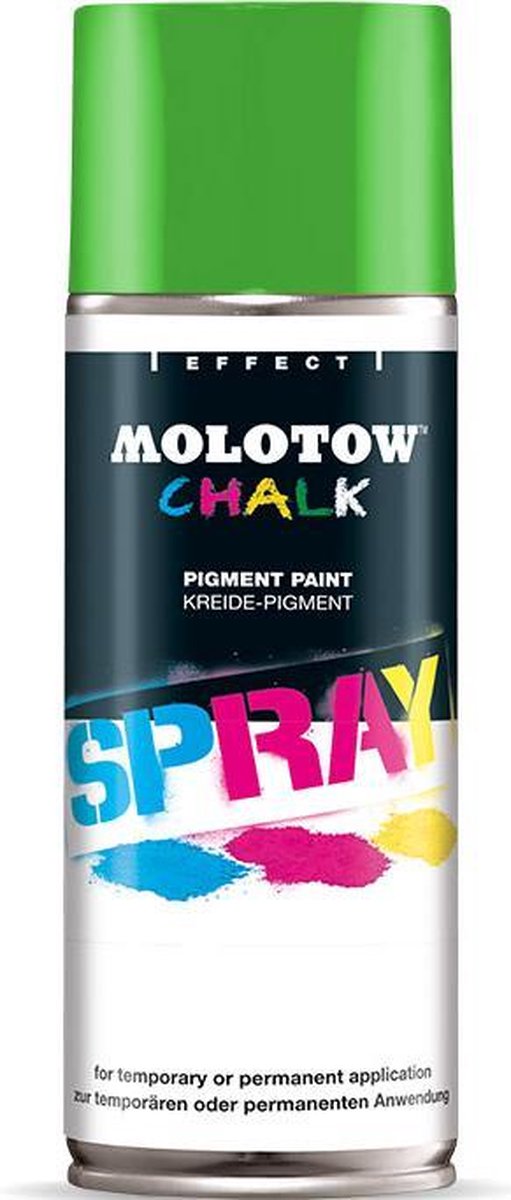 Molotow Streetwise Krijtspray 400ml Met een spuitbus van 400ml dek je gemiddeld een oppervlak van 2 vierkante meter. Deze Molotow Streetwise Krijtspray 400ml is handig voor alle tijdelijke toepassingen. De pigment chalk spray is makkelijk af te spoelen na gebruik, waardoor je geen permanente schade op je naam hebt staan. Onder andere toe te passen op asfalt, beton, hout, grind, bomen etc. De natuurlijke krijt pigmenten verdwijnen als gevolg van weersinvloeden of door het reinigen met water. Het zal aanrakings droog zijn na een paar minuten en het wordt iets lichter na 30 minuten.