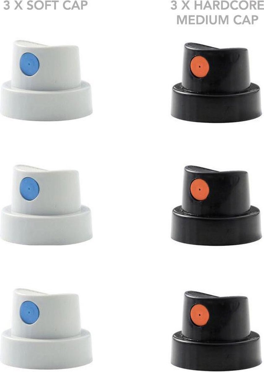 Dit pakket bevat een mix van 6 MTN medium caps. Deze caps geven een "medium" lijndikte. Niet te dik en niet te dun, hierdoor geschikt voor de meeste spuitklussen. – 3x MTN Soft Cap – 3x MTN Hardcore Medium Cap Deze caps passen op elke reguliere spuitbus met een vrouwelijk ventiel.