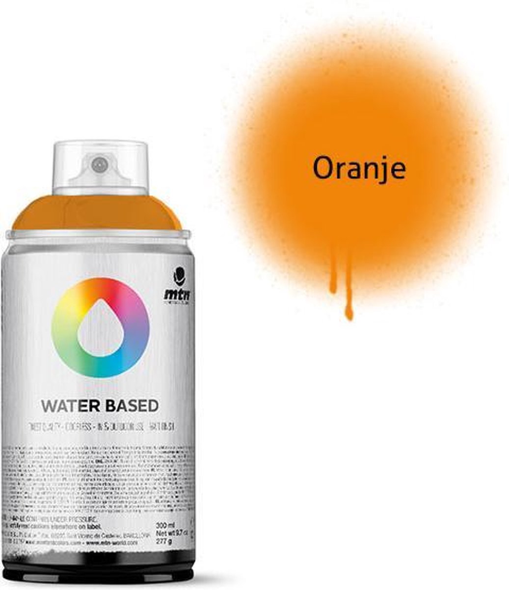 MTN Water Based 300ml Spray Paint Met een 300ml dek je gemiddeld een oppervlak van 1,5 vierkante meter. Iedere spuitbus wordt geleverd met een pocket cap, deze geeft een normale lijndikte. Deze MTN Water Based 300ml Spray Paint is perfect voor kinderen, fine-art, graffiti en andere doeleinden. Deze spuitverf is op water basis en hierdoor totaal niet giftig en 100% geurloos. Daarnaast is de spuitbus lage druk, voor veel controle en heeft de verf een matte afwerking. Deze spuitbussen zijn komen in 300ml, waardoor ze ook voor kinderhanden geschikt zijn. De verf is geurloos en dus perfect voor binnengebruik. Daarnaast is de verf zolang het nog nat is makkelijk te verwijderen met water. De droogtijd is +- 20 minuten. Geschikt voor diverse ondergronden zoals: polystyreen, hout, metaal, glas, cement etc.