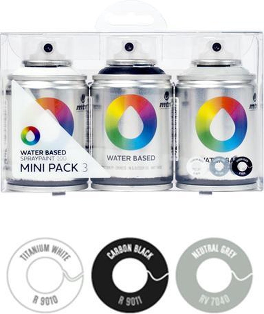 MTN Water Based 100 Workshop 3-Pack Zwart/Wit/Grijs Verpakkingsgrootte: 3 x 100 ml Cap meegeleverd: Pocket Cap Spuitverf geformuleerd met in water oplosbare, geurarme harsen van de hoogste kwaliteit. Een aanrader voor beeldende kunst, graffiti kunst en vele andere professionele projecten. Perfect voor zowel binnen- als buitenwerk. Als de verf droog is, is deze watervast. Geschikt voor gebruik op alle soorten oppervlakken, inclusief polystyreen. Verse vlekken kunnen worden verwijderd met alleen zeep en water gedurende de eerste 20 – 25 minuten. 1x Carbon Black 1x Titanium White 1x Neutral Grey