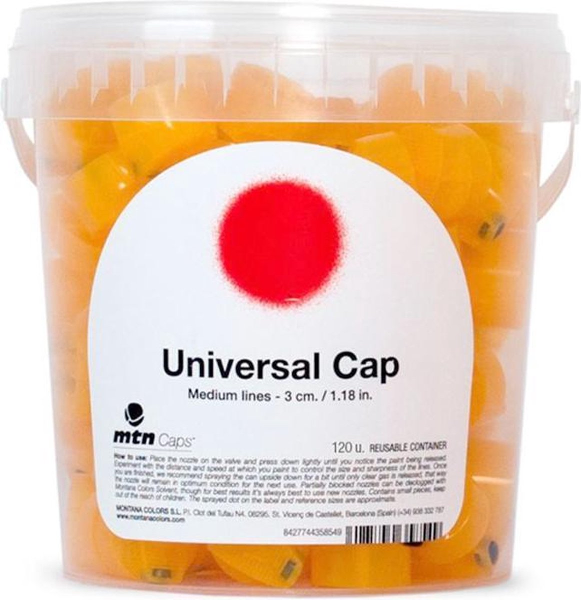 MTN Universal Cap Bucket 120 stuks De MTN Yellow Universal Cap (ook wel ‘banana’ cap genoemd) is een fijne skinny cap, die werkt op al onze merken spuitbussen, ideaal voor outlines en ander gedetailleerd werk. Lijndikte van 3 cm ø. / 1.2 in.