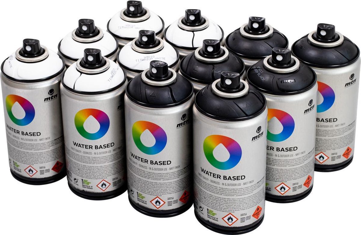 Dit graffiti spuitbussen pakket bevat 6 zwarte en 6 witte 300ml spuitbussen op waterbasis in verschillende tinten. Deze MTN Water Based 300ml Spray Paint is perfect voor kinderen, fine-art, graffiti en andere doeleinden. Deze spuitverf is op water basis en hierdoor totaal niet giftig en 100% geurloos. Daarnaast is de spuitbus lage druk, voor veel controle en heeft de verf een matte afwerking. Deze spuitbussen zijn komen in 300ml, waardoor ze ook voor kinderhanden geschikt zijn. De verf is geurloos en dus perfect voor binnengebruik. Daarnaast is de verf zolang het nog nat is makkelijk te verwijderen met water. De droogtijd is +- 20 minuten. Geschikt voor diverse ondergronden zoals: polystyreen, hout, metaal, glas, cement etc. Dit pakket bevat de volgende kleuren 6x MTN Water Based Paint (300ml) - Carbon Black RV-9011 6x MTN Water Based Paint (300ml) - Titanium White RV-9010