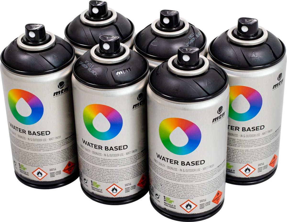 Dit graffiti spuitbussen pakket bevat 6 zwarte 300ml spuitbussen op waterbasis in verschillende tinten. Deze MTN Water Based 300ml Spray Paint is perfect voor kinderen, fine-art, graffiti en andere doeleinden. Deze spuitverf is op water basis en hierdoor totaal niet giftig en 100% geurloos. Daarnaast is de spuitbus lage druk, voor veel controle en heeft de verf een matte afwerking. Deze spuitbussen zijn komen in 300ml, waardoor ze ook voor kinderhanden geschikt zijn. De verf is geurloos en dus perfect voor binnengebruik. Daarnaast is de verf zolang het nog nat is makkelijk te verwijderen met water. De droogtijd is +- 20 minuten. Geschikt voor diverse ondergronden zoals: polystyreen, hout, metaal, glas, cement etc. Dit pakket bevat de volgende kleuren 6x MTN Water Based Paint (300ml) - Carbon Black RV-9011