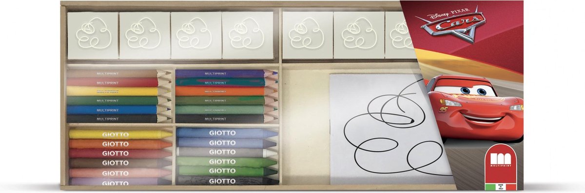 Multiprint Cars kleurset Hoe snel kan jij tekenen? Of teken je liever een supersnelle auto? Met alle kleurpotloden en waskrijtjes van de regenboog en zeven gave stempels teken jij het kladblok vol met de stoerste Cars-karakters. Specificaties: Kleur: multicolor Geslacht: junior Materiaal: hout, papier, kunststof Afmetingen verpakking: 41,6 x 17,2 x 3 cm (L x B x D) Afmetingen kladblok: 15,7 x 10 cm (L x B) Afmetingen stempels: 4,3 x 4,3 x 1,2 cm (L x B x D) Leeftijd: vanaf 3 jaar Let op, de stempels en kladblokken kunnen afwijken van de afbeelding. Inhoud: 12 Potloden 12 Waskrijtjes 7 Stempels 1 Stempelkussen 1 Kladblok 1 Houten bewaardoos