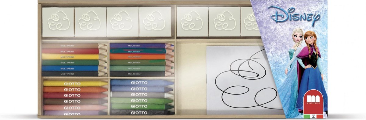 Multiprint Frozen kleurset Teken het prachtige Arendelle samen met Anna en Elsa. Met alle kleurpotloden en waskrijtjes van de regenboog en zeven gave stempels teken jij het kladblok vol met de leukste avonturen. Specificaties: Kleur: multicolor Geslacht: junior Materiaal: hout, papier, kunststof Afmetingen verpakking: 41,6 x 17,2 x 3 cm (L x B x D) Afmetingen kladblok: 15,7 x 10 cm (L x B) Afmetingen stempels: 4,3 x 4,3 x 1,2 cm (L x B x D) Leeftijd: vanaf 3 jaar Let op, de stempels en kladblokken kunnen afwijken van de afbeelding. Inhoud: 12 Potloden 12 Waskrijtjes 7 Stempels 1 Stempelkussen 1 Kladblok 1 Houten bewaardoos