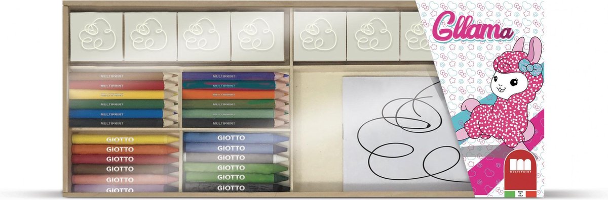 Multiprint Gllama kleurset Ga op een tekenavontuur met Gllama de modieuze lama. Met alle kleurpotloden en waskrijtjes van de regenboog en zeven gave stempels teken jij het kladblok vol met de mooiste lama's. Specificaties: Kleur: multicolor Geslacht: junior Materiaal: hout, papier, kunststof Afmetingen verpakking: 41,6 x 17,2 x 3 cm (L x B x D) Afmetingen kladblok: 15,7 x 10 cm (L x B) Afmetingen stempels: 4,3 x 4,3 x 1,2 cm (L x B x D) Leeftijd: vanaf 3 jaar Let op, de stempels en kladblokken kunnen afwijken van de afbeelding. Inhoud: 12 Potloden 12 Waskrijtjes 7 Stempels 1 Stempelkussen 1 Kladblok 1 Houten bewaardoos
