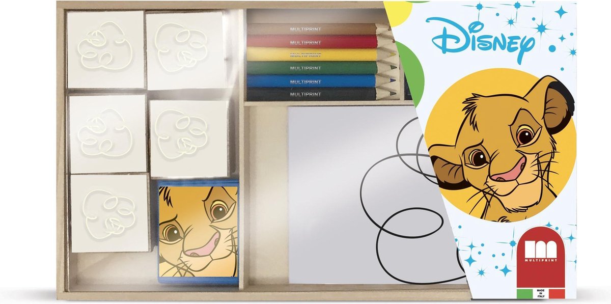 Multiprint Lion King kleurset Ga op een supertof kleuravontuur met Simba uit de Lion King. Met alle kleurpotloden van de regenboog en vijf gave stempels teken jij het kladblok vol met kleurrijke Lion King-tekeningen. Specificaties: Kleur: multicolor Geslacht: junior Materiaal: hout, papier, kunststof Afmetingen verpakking: 29 x 17,2 x 3 cm (L x B x D) Afmetingen kladblok: 15,7 x 10 cm (L x B) Afmetingen stempels: 4,3 x 4,3 x 1,2 cm (L x B x D) Leeftijd: vanaf 3 jaar Let op, de stempels en kladblokken kunnen afwijken van de afbeelding. Inhoud: 12 Potloden 5 Stempels 1 Stempelkussen 1 Kladblok 1 Houten bewaardoos