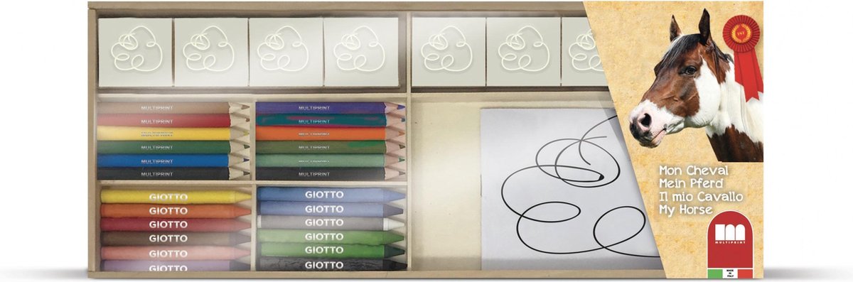 Multiprint Mijn Paard kleurset Teken jouw trouwe knol op zijn mooist en laat in beeld zien hoeveel je van hem houdt. Met alle kleurpotloden en waskrijtjes van de regenboog en zeven gave stempels teken jij het kladblok vol met prachtige paarden. Specificaties: Kleur: multicolor Geslacht: junior Materiaal: hout, papier, kunststof Afmetingen verpakking: 41,6 x 17,2 x 3 cm (L x B x D) Afmetingen kladblok: 15,7 x 10 cm (L x B) Afmetingen stempels: 4,3 x 4,3 x 1,2 cm (L x B x D) Leeftijd: vanaf 3 jaar Let op, de stempels en kladblokken kunnen afwijken van de afbeelding. Inhoud: 12 Potloden 12 Waskrijtjes 7 Stempels 1 Stempelkussen 1 Kladblok 1 Houten bewaardoos