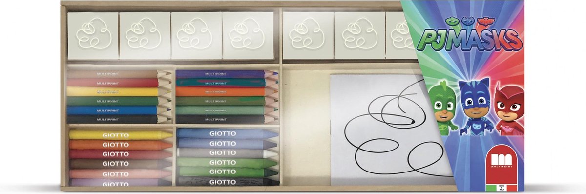 Multiprint PJ Masks kleurset Teken jezelf tussen de heldhaftige PJ Masks. Met alle kleurpotloden en waskrijtjes van de regenboog en zeven gave stempels teken jij het kladblok vol met de spannendste avonturen. Specificaties: Kleur: multicolor Geslacht: junior Materiaal: hout, papier, kunststof Afmetingen verpakking: 41,6 x 17,2 x 3 cm (L x B x D) Afmetingen kladblok: 15,7 x 10 cm (L x B) Afmetingen stempels: 4,3 x 4,3 x 1,2 cm (L x B x D) Leeftijd: vanaf 3 jaar Let op, de stempels en kladblokken kunnen afwijken van de afbeelding. Inhoud: 12 Potloden 12 Waskrijtjes 7 Stempels 1 Stempelkussen 1 Kladblok 1 Houten bewaardoos