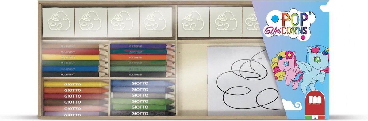 Multiprint Pop Unicorns kleurset Laat alle kleuren poppen met de Pop Unicorns. Met alle kleurpotloden en waskrijtjes van de regenboog en zeven gave stempels teken jij het kladblok vol met de meest kleurrijke eenhoorns. Specificaties: Kleur: multicolor Geslacht: junior Materiaal: hout, papier, kunststof Afmetingen verpakking: 41,6 x 17,2 x 3 cm (L x B x D) Afmetingen kladblok: 15,7 x 10 cm (L x B) Afmetingen stempels: 4,3 x 4,3 x 1,2 cm (L x B x D) Leeftijd: vanaf 3 jaar Let op, de stempels en kladblokken kunnen afwijken van de afbeelding. Inhoud: 12 Potloden 12 Waskrijtjes 7 Stempels 1 Stempelkussen 1 Kladblok 1 Houten bewaardoos