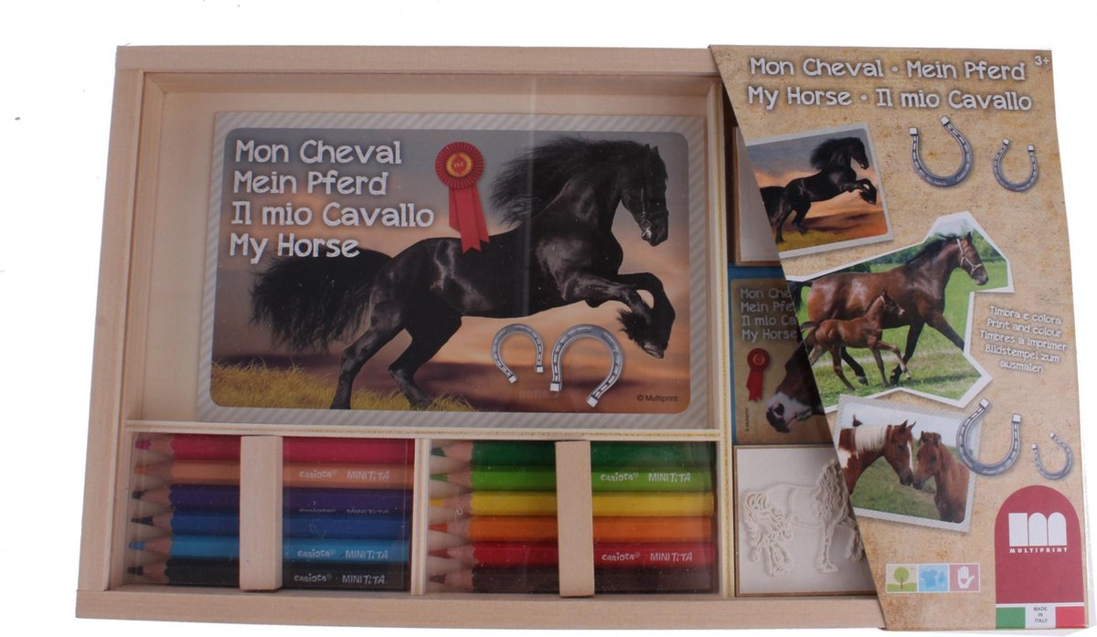 Multiprint kleurset Zet één van de vijf paarden-stempels op papier en kleur het daarna in met de bijgeleverde potloden. De houten stempels zijn van een goede kwaliteit zodat urenlang knutselplezier gegarandeerd is! Specificaties: Kleur: multicolor Geslacht: junior Materiaal: kunststof, hout Afmeting verpakking: 19,5 x 17 cm Afmetingen stempel: 4,5 x 4,5 cm Lengte potlood: 8,5 cm Leeftijd: vanaf 3 jaar Inhoud: 1 Notitieboekje 5 Houten stempels 1 Stempelkussen 12 Kleurpotloden