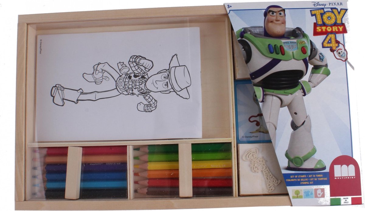 Multiprint kleurset Hou jij van stempelen en kleuren? Dan is deze kleurset echt iets voor jou. De set bestaat uit vijf stempels van Toy Story 4, een stempelkussen en 12 kleurpotloden om lekker mee te knutselen! Specificaties: Kleur: multicolor Geslacht: junior Materiaal: kunststof, hout Afmeting verpakking: 19,5 x 17 cm Afmetingen stempel: 4,5 x 4,5 cm Lengte potlood: 8,5 cm Leeftijd: vanaf 3 jaar Inhoud: 1 Notitieboekje 5 Houten stempels 1 Stempelkussen 12 Kleurpotloden