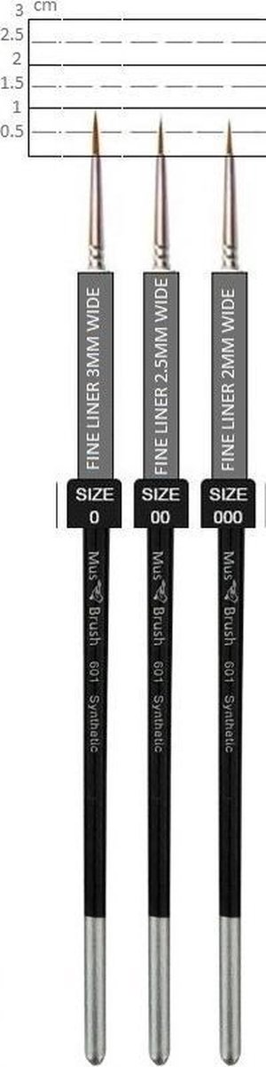 Deze set bestaat uit 6 penselen met een punt: 2x MusBrush-serie 601 fine detail - FineLiner No. 0 2x MusBrush-serie 601 fine detail - FineLiner No. 00 2x MusBrush-serie 601 fine detail - FineLiner No. 000 Info over de hele 601 serie: MusBrush fine detail 601 serie is een prachtige serie fijne synthetische penselen met een korte zwarte steel, de penselen zijn te gebruiken voor alle technieken en verfsoorten, de hele serie bestaat uit 11 verschillende penselen. MusBrush-serie 601 fine detail - Angle 1/4 MusBrush-serie 601 fine detail - flat No. 8 MusBrush-serie 601 fine detail - Round No. 5 MusBrush-serie 601 fine detail - Round No. 5/0 MusBrush-serie 601 fine detail - FineLiner No. 0 MusBrush-serie 601 fine detail - FineLiner No. 00 MusBrush-serie 601 fine detail - FineLiner No. 000 MusBrush-serie 601 fine detail - ScriptLiner No. 000 MusBrush-serie 601 fine detail - ScriptLiner No. 00 MusBrush-serie 601 fine detail - ScriptLiner No. 0 MusBrush-serie 601 fine detail - flat No. 3/4
