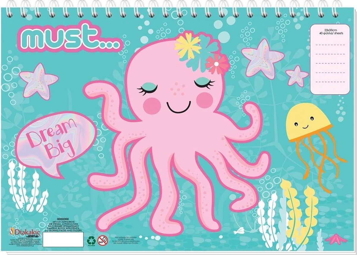 Must Inktvis sticker- en Kleurboek Haal al je potloden, stiften en andere spulletjes uit de kast en maak de mooiste tekeningen in dit sticker- en kleurboek. Het boek bevat veertig pagina's met tekeningen en twee stickervellen. Specificaties: Kleur: roze, turquoise Geslacht: unisex Materiaal: papier Afmetingen: 23 x 33 cm Aantal pagina's: 40 Leeftijd: vanaf 4 jaar